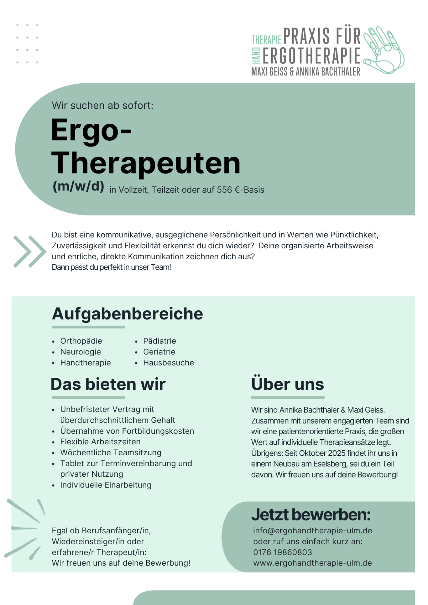 Ergotherapie unterstützt Menschen dabei, ihre Selbstständigkeit im Alltag (wieder) zu erlangen - sei es nach einer Krankheit, Verletzung oder aufgrund einer körperlichen oder geistigen Beeinträchtigung. In unserer Praxis für Ergotherapie in Ulm fördern wir gezielt die Handlungsfähigkeit durch individuell abgestimmte Therapieansätze. Unser Angebot richtet sich an Kinder und Erwachsene gleichermaßen. Bei Kindern liegt der Fokus häufig auf sensorischer Integration, Konzentrationstraining und der Förderung motorischer sowie kognitiver Fähigkeiten. Erwachsene profitieren insbesondere von unserem Spezialgebiet, der Handtherapie, die nach Operationen, Unfällen oder bei chronischen Erkrankungen eingesetzt wird. Ziel der Ergotherapie ist es, die größtmögliche Unabhängigkeit im Alltag, Beruf oder Schulalltag zu erreichen. Dabei begleiten wir Sie mit Fachkompetenz, Empathie und einem ganzheitlichen Therapieansatz.